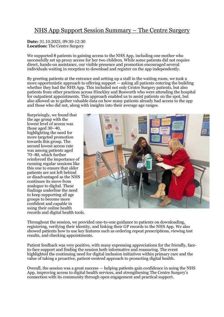We would like to thank our NHS APP Ambassadors for attending the surgery on the 31st October and supporting our patients with the NHS app. Please read below the support session summary👇👇
